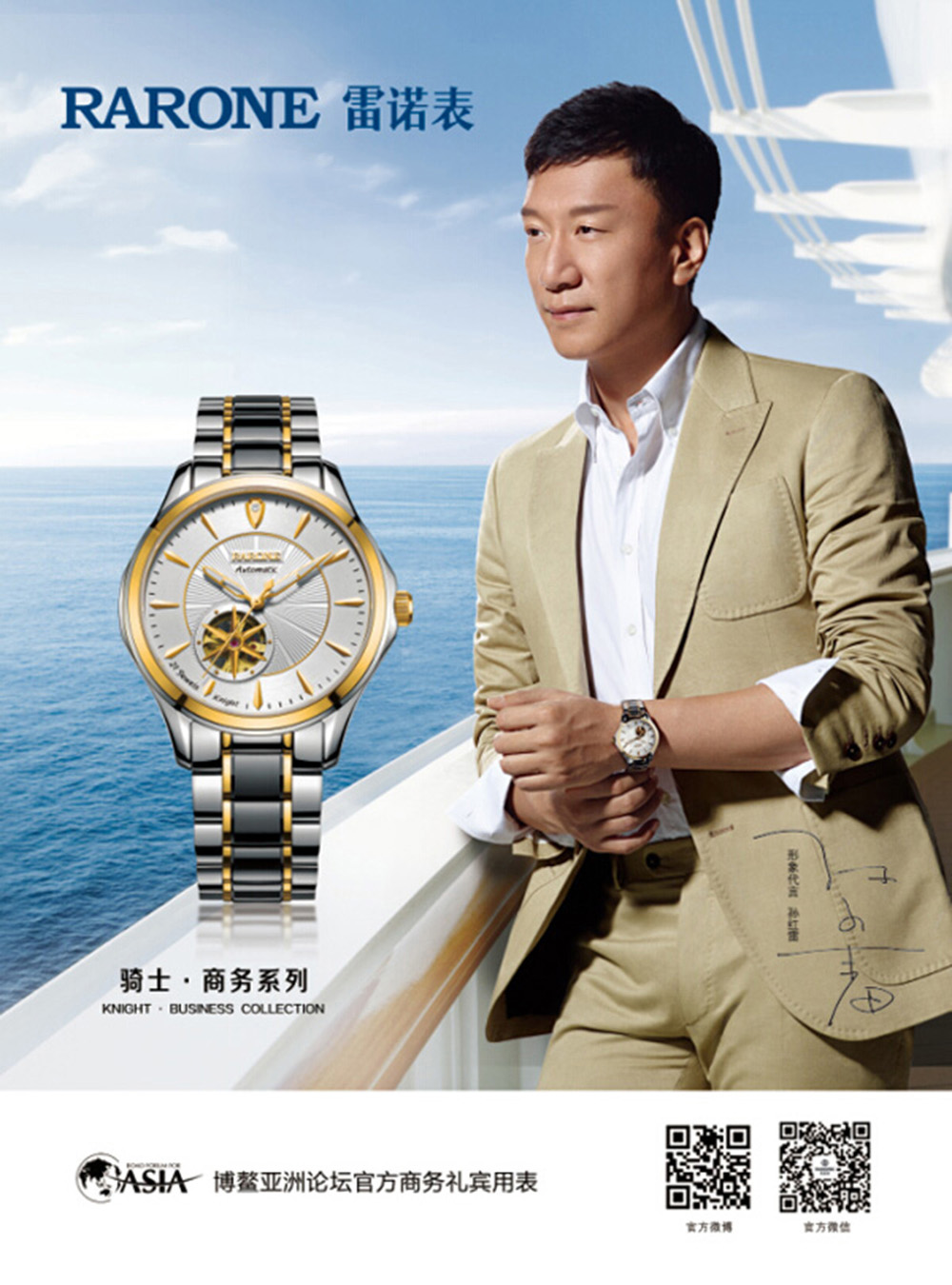 同時(shí),作為商務(wù)手表品牌,雷諾表自2010年起成為博鰲亞洲論壇長期合作伙伴,并每年為參會(huì)的政商界精英敬獻(xiàn)商務(wù)之禮,并于2011年起邀請(qǐng)著名影星孫紅雷先生正式代言雷諾表。