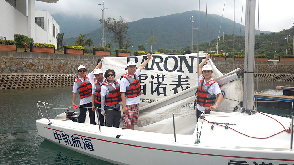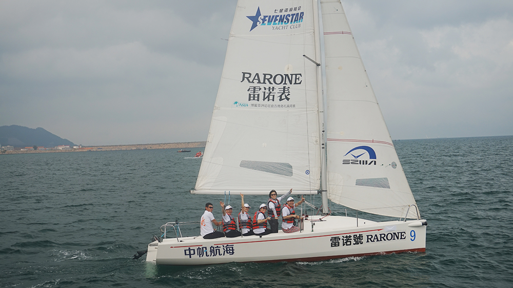 下午,海面迎來微涼的海風,令人心情開朗。開闊的海面,清綠的海水,飽滿的士氣,雷諾團隊揚起專屬雷諾表的“雷諾號”帆船。雷諾表董事長詹西洲先生親自率領雷諾團隊一同登上“雷諾號”,在海面上開始了與其他深圳鐘表品牌的帆船友誼賽。